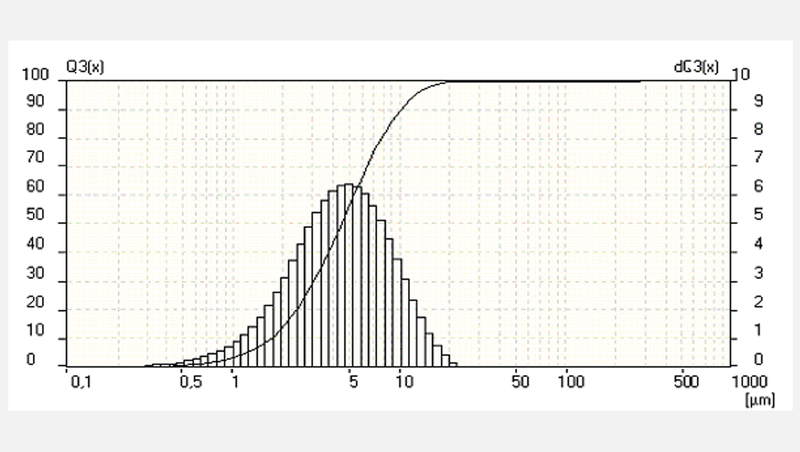 The dependency of the visual image of the metal effect varnishes is here substantially influenced by particle diameter of the used additive. The shown below distribution is an especially finely ground polymethyl urea resin, measured with an ANALYSETTE 22 in an organic solution with a small volume dispersion unit.